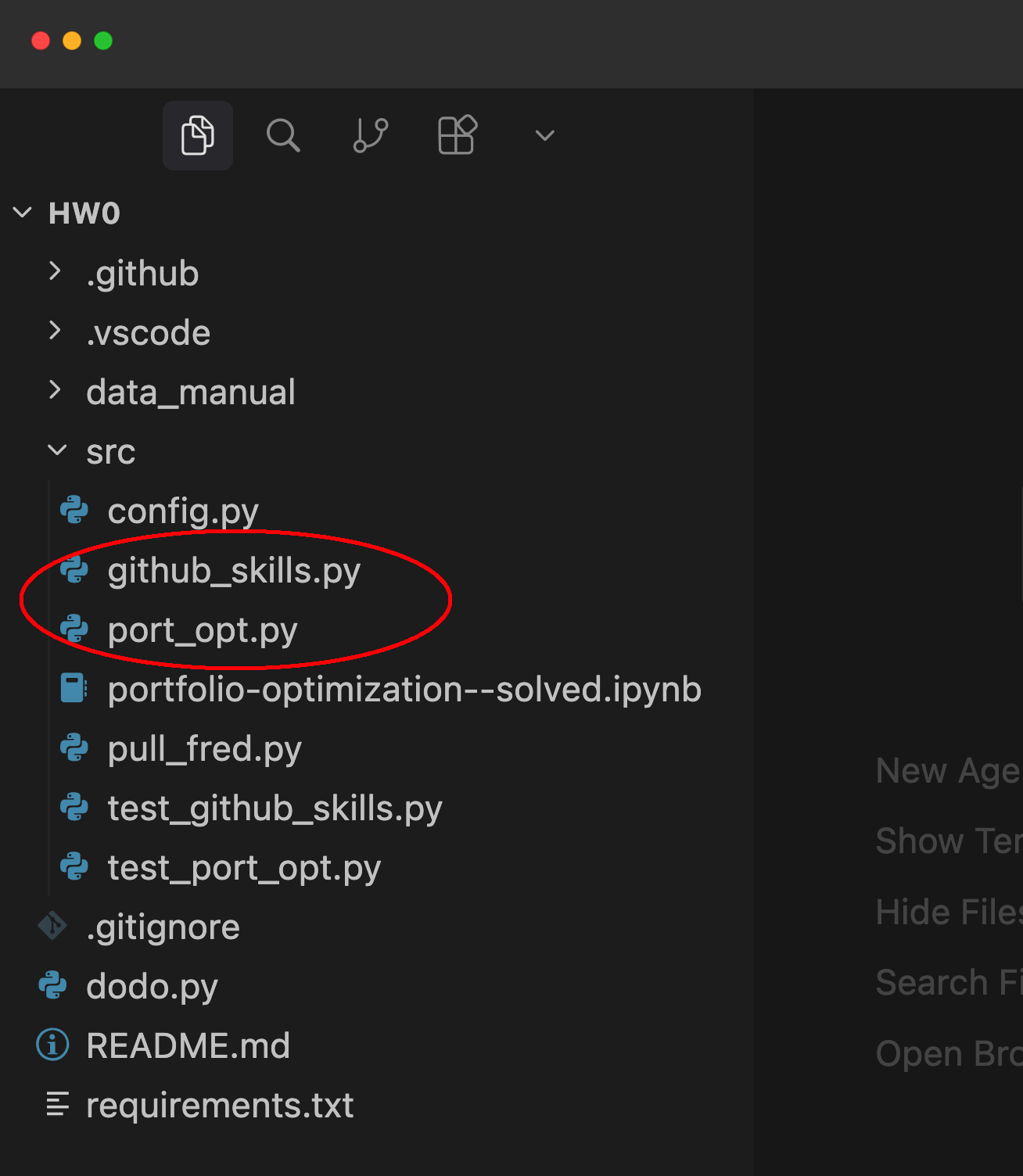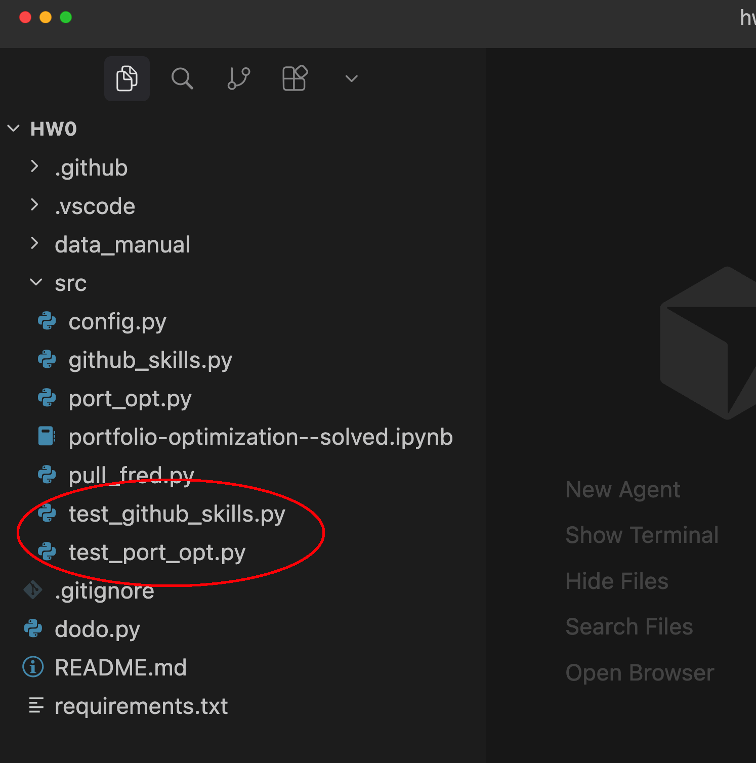 In order to complete the homework, you need to adjust the source files so that the unit test files pass. The unit tests are implemented in the files that start with test_FILENAME.py. The files indicated by the red bracket below are the test files. In HW0, you will need to edit github_skills.py and port_opt.py.