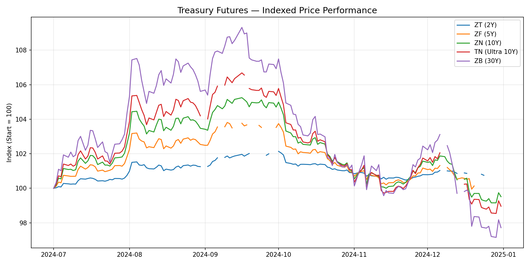 The chart below normalizes each product’s closing price to 100 at the start of the sample and tracks relative performance. Products with longer duration (ZB, TN) show larger price swings — exactly what we expect given the inverse relationship between bond prices and yields.
