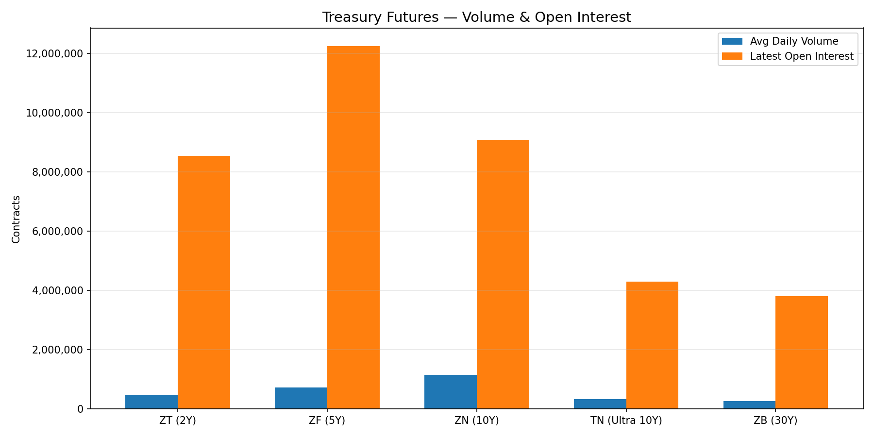 Volume and open interest reveal where liquidity concentrates. The 10-Year T-Note (ZN) typically dominates both metrics, making it the benchmark for Treasury futures trading.